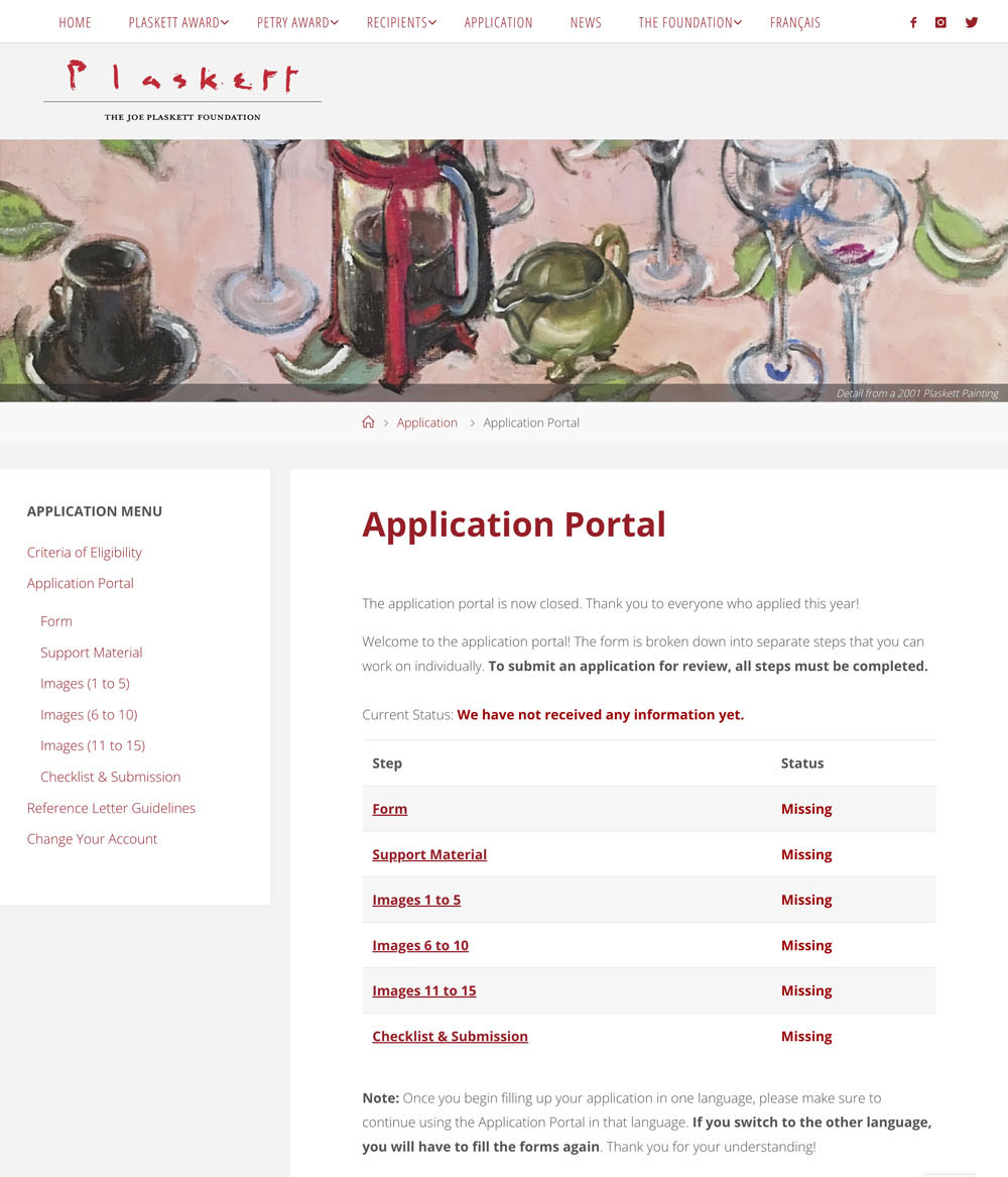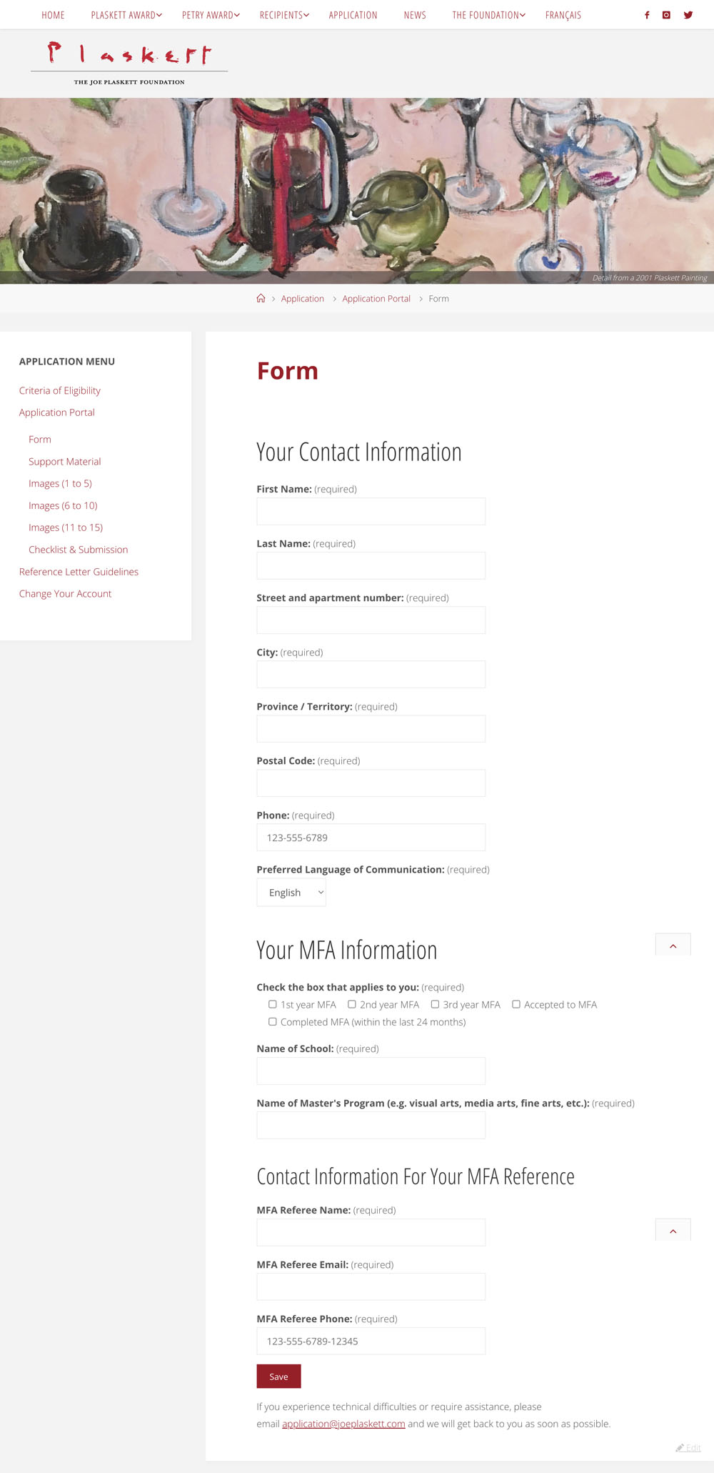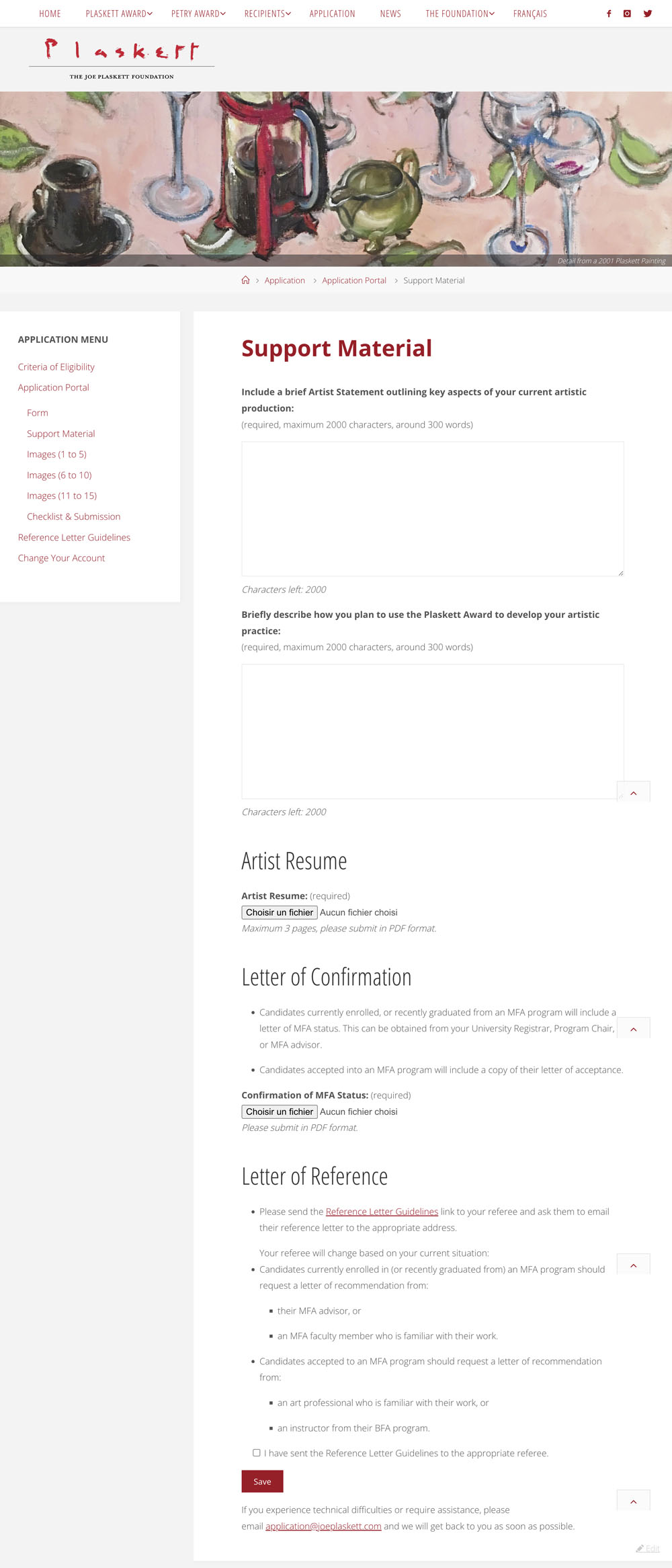Finally, the Letter of Reference should be sent to the Joe Plaskett Foundation directly by their referee, on official letterhead and from their institutional/professional email address. The Support Material form, as well as the Reference Letter Guidelines, include all the necessary information.